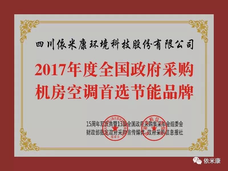 2018年1月7日,由中國(guó)政府采購(gòu)信息報(bào)主辦的“15周年雙慶典暨13屆全國(guó)政府采購(gòu)集采年會(huì)”在北京成功舉辦。為推動(dòng)政府采購(gòu)事業(yè)更好更快發(fā)展,盛會(huì)匯聚了全國(guó)重點(diǎn)政府采購(gòu)監(jiān)管部門(mén)、中央級(jí)集采機(jī)構(gòu)以及中央重要采購(gòu)單位,依米康作為國(guó)內(nèi)領(lǐng)先的數(shù)據(jù)中心整體解決方案服務(wù)商受邀出席本次盛會(huì),并一舉榮獲“2017年度全國(guó)政府采購(gòu)機(jī)房空調(diào)首選節(jié)能品牌”年度大獎(jiǎng)!
